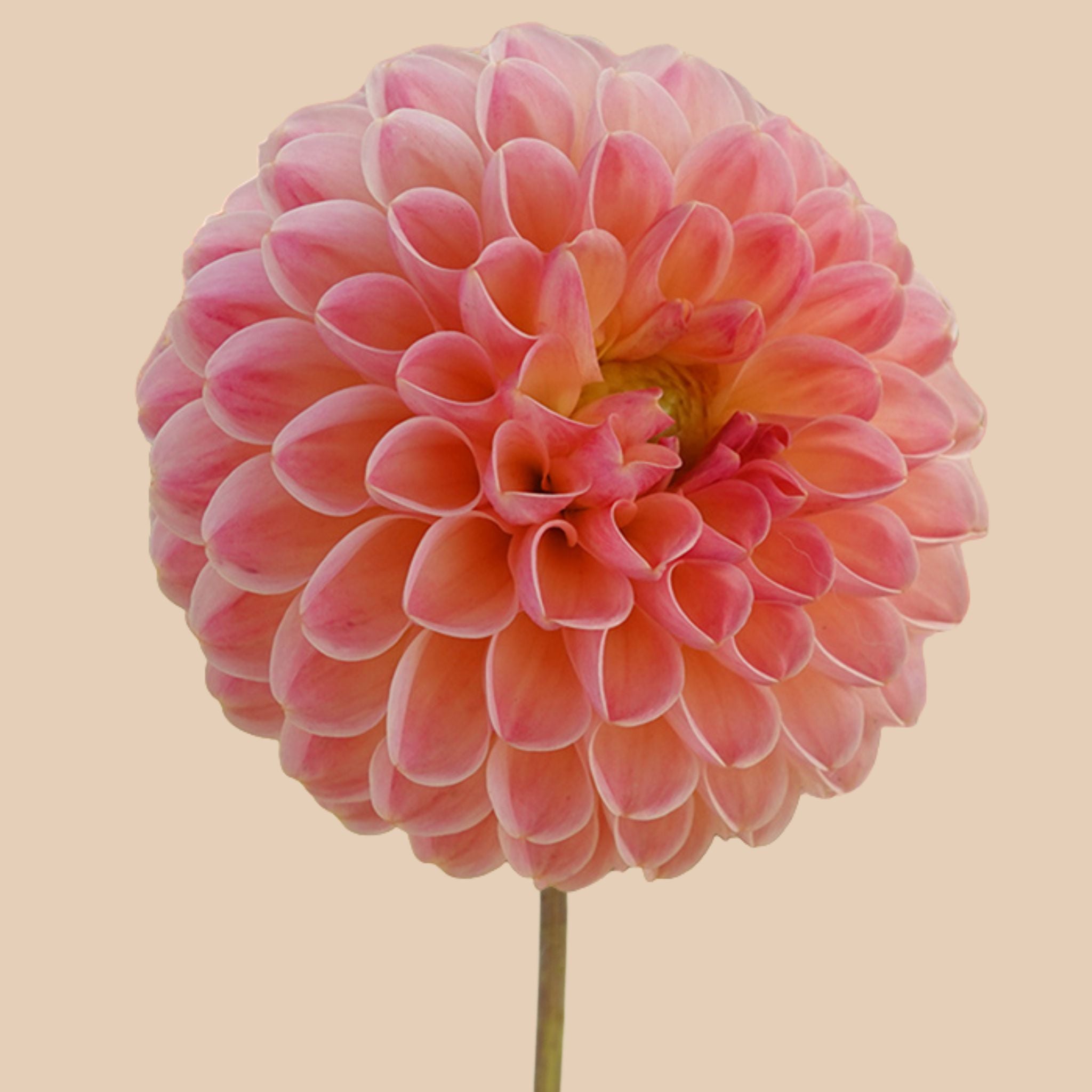 Its soft peachy pink hues complement almost any color palette and are a lovely base for endless combinations with other dahlia varieties. It blooms profusely and boasts strong, long stems, making it a beautiful vase plant.