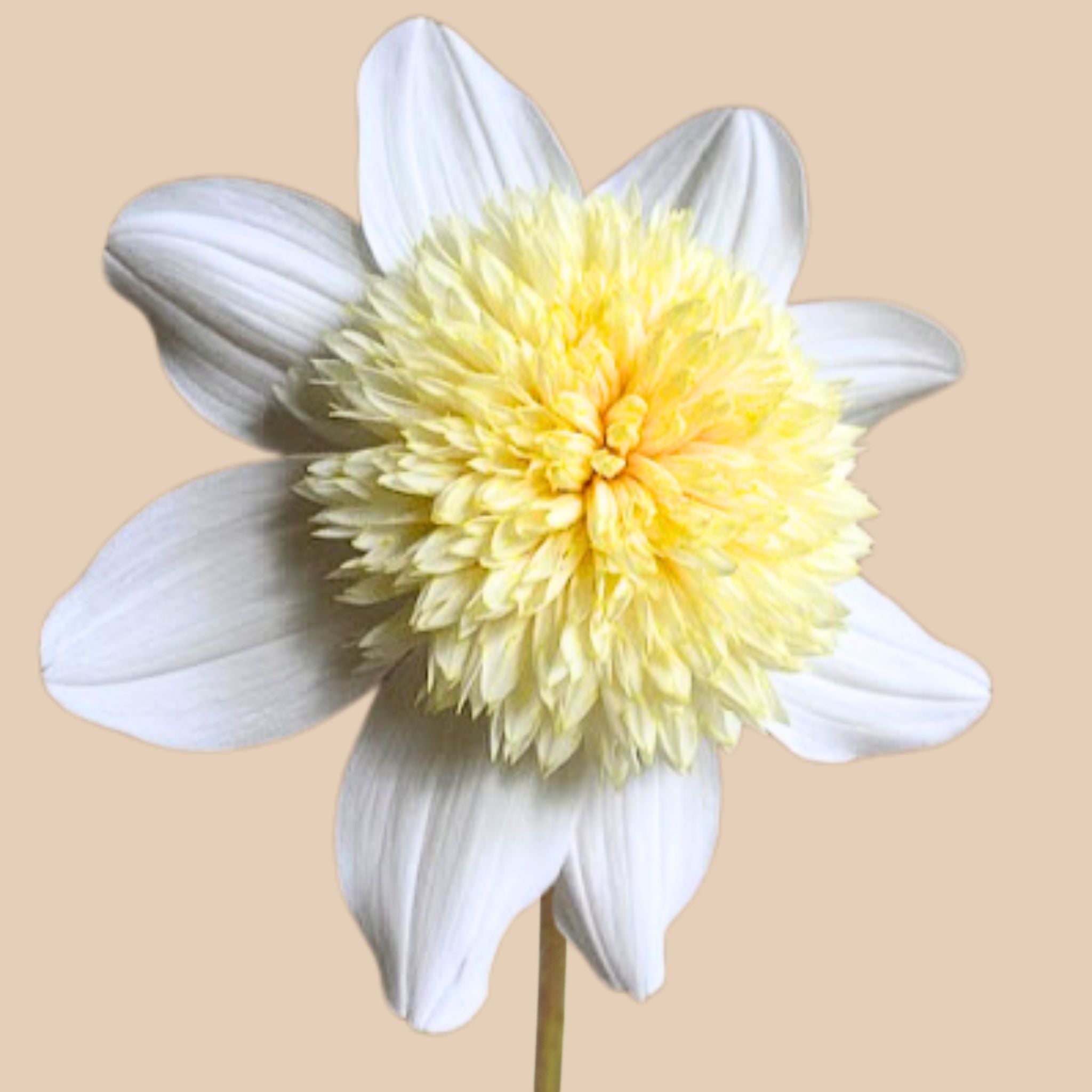 Dahlia 'Platinum Blonde' – delicate white with a buttery yellow center