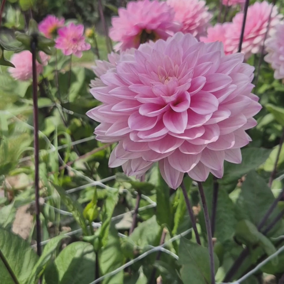 Dahlia ‘Karma Prospero’ is speciaal geïntroduceerd voor de snijbloemenwereld, maar ik vind haar net zo goed een aanwinst voor de tuin. Haar bloemen zijn zachtroze met een licht vleugje lila. Met hun waterlelieachtige vorm en donkere stelen steken ze mooi boven de groene contrasterende bladeren uit.