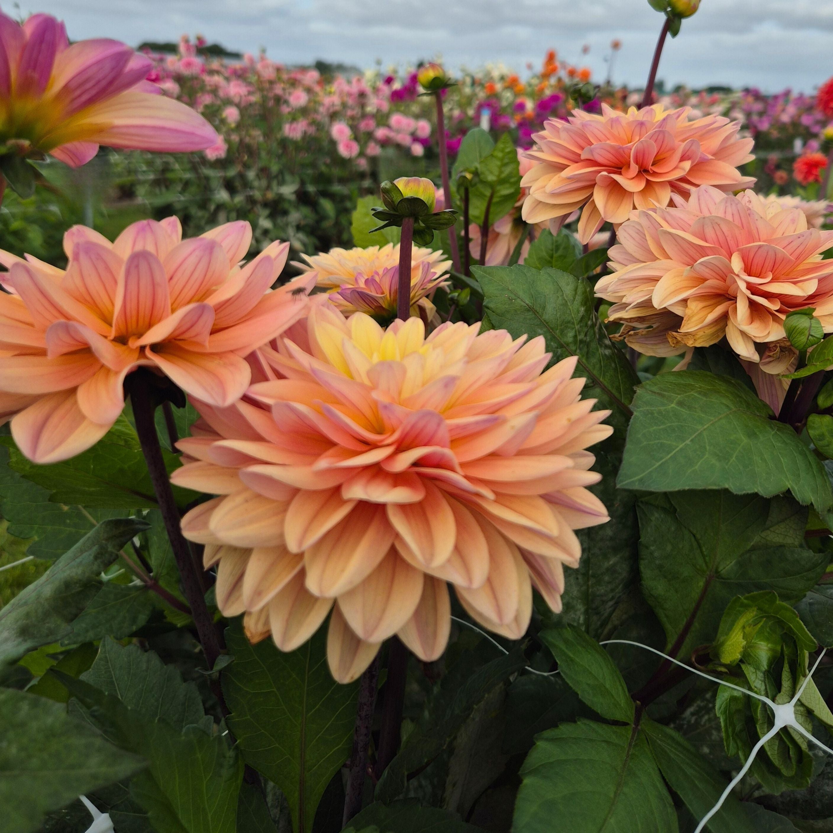 Dahlia ‘Mondriaan’ voelt bijna als een doos pastel gekleurde snoepjes in je tuin. Haar bloemen zijn ongeveer 12 cm groot en laten een zacht kleurenpalet zien van roze, abrikoos, citroengeel en een vleugje lavendel. Precies die subtiele mix maakt haar zo bijzonder en veelzijdig.