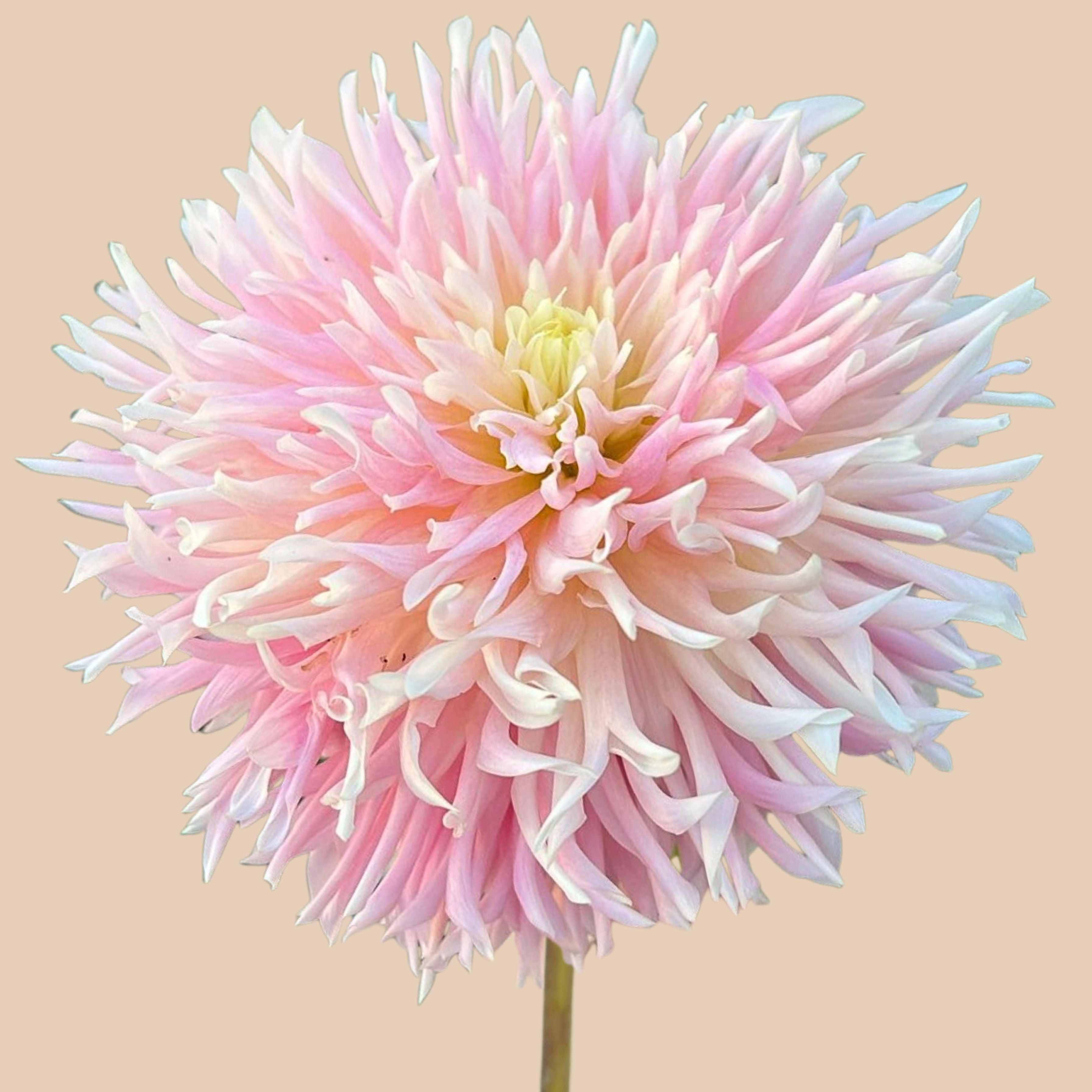 Dahlia ‘Nadia Ruth’ voelt als een zachte knuffel in een bloemvorm. Haar grote bloemen van 20 cm zijn opgebouwd uit fijne, diep ingesneden bloemblaadjes die bijna pluizig ogen. De zachte kleuren van pastelroze met een lichte, boter crèmekleurige kern maken het zachte knuffelige plaatje compleet.