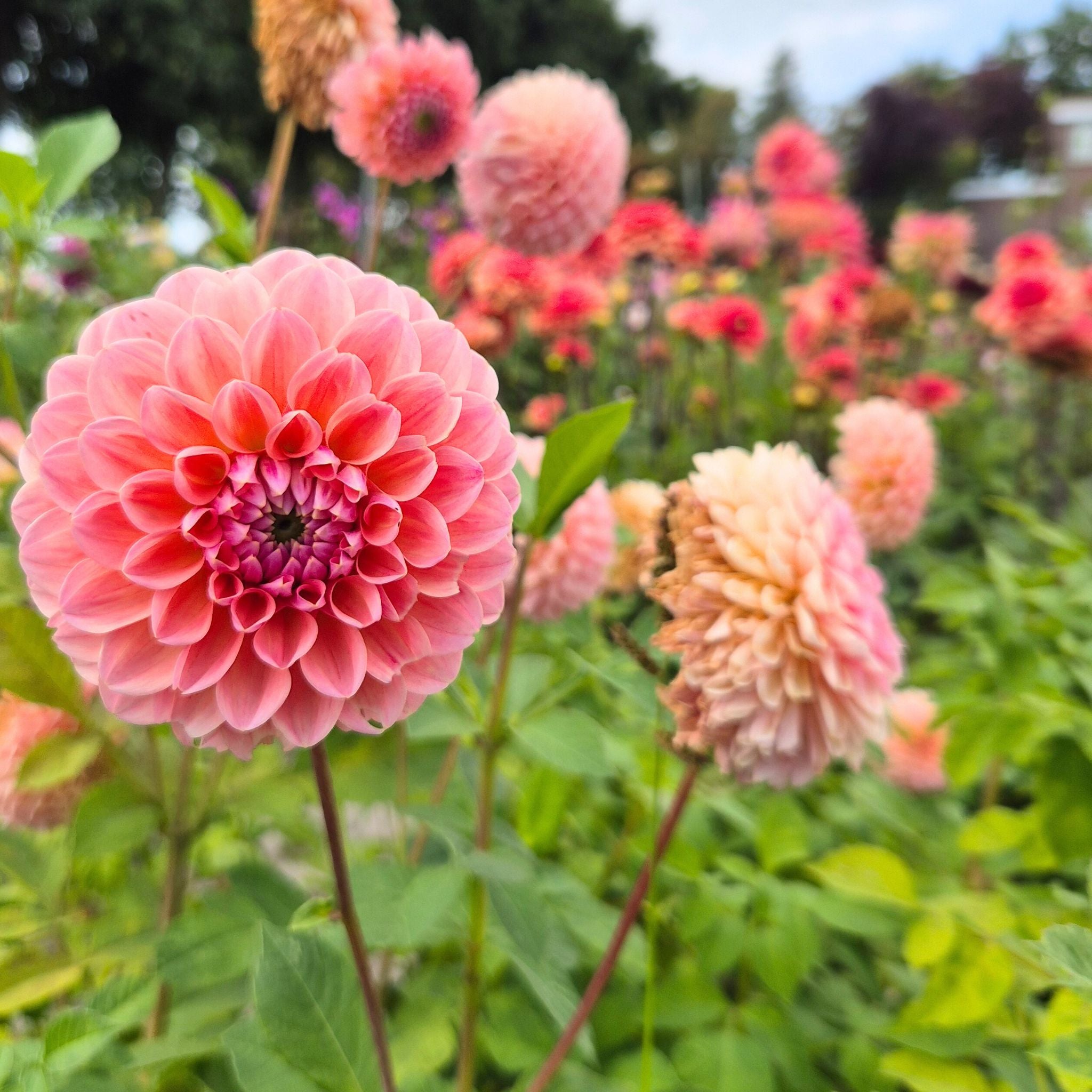 Dahlia ‘Nathalie G’ is er zo eentje die je meteen in je hart sluit. Ze wordt ook wel een miniatuur ball dahlia genoemd, vanwege haar kleine maar fijne verschijning. De bloemen hebben een diameter van 8 cm en zijn daarmee heel leuk te combineren met andere juist grotere dahliasoorten, zo creëer je een luchtig en speels effect. De ronde bloemen hebben een zacht perzikroze kleur met een warme zalmtoon en een vleugje geel aan de basis van de bloemblaadjes.