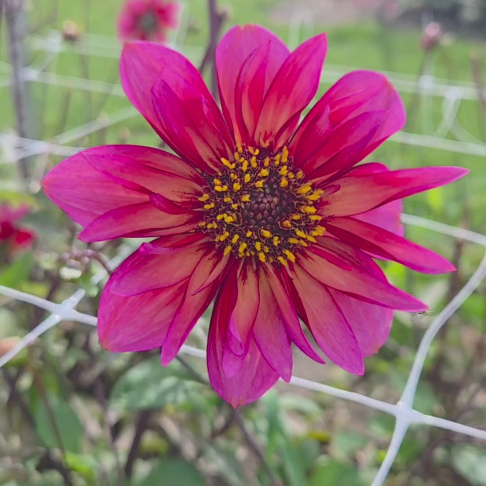 Dahlia ‘Princess Nadine’ bloeit rijk en langdurig, van de zomer tot de eerste vorst. De planten worden zo’n 100 cm hoog en staan stevig op hun stelen. De bloemen hebben een speels contrast door het gouden hart wat omringd is door een kraag van opgerolde bloemblaadjes. Daardoor oogt ze voller dan veel andere enkelbloemige dahlia’s. Ook in de vaas blijft ze lang mooi, waardoor ze geliefd is als snijbloem.