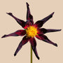 Dahlia ‘Verrone’s Obsidian’ heeft stervormige bloemen ze zijn zo diep donkerrood dat ze bijna zwart lijken. In het midden straalt een felgeel hart vol nectar, een onweerstaanbare uitnodiging voor bijen, hommels en vlinders. Haar bloemblaadjes zijn iets gedraaid waardoor ze een mooie delicate uitstraling heeft. Een klein kunstwerk!