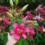 Boomlelie Rio Negro brengt stelen die wel 2m hoog boven de tuin uisteken, met glanzende scarlet roze tot paarse bloemen en goude stuifmeeldraden. Lilium ‘Rio Negro’ de naam alleen al schept hoge verwachtingen en dat zal deze boomlelie ook zeker waar maken.